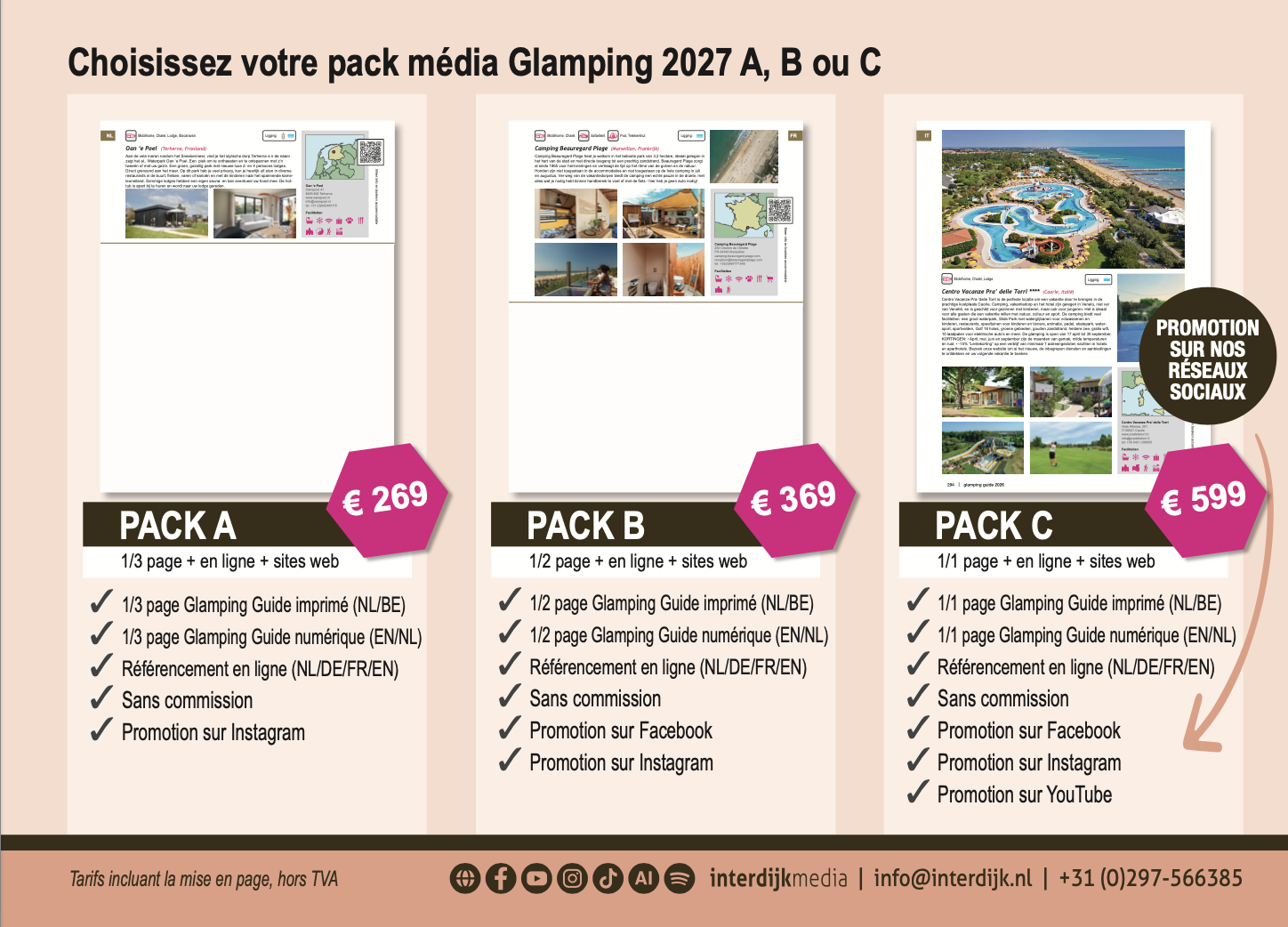 1/3 page Glamping Guide 2027 (imprimé NL + digital NL + EN) + 4 sites Web NL + DE + FR+ EN 2027 € 269,-