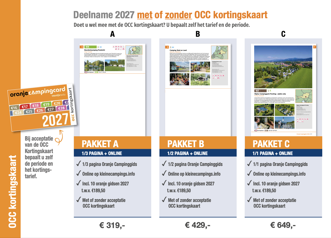 Kies uw deelnamepakket 2027 A 1/3 pagina Oranje Campinggids 2027 + pagina op de website: € 319 B 1/2 pagina Oranje Campinggids 2027 + pagina op de website: € 429 C 1/1 pagina Oranje Campinggids 2027 + pagina op de website: € 649 Acceptatie OCC Kortingskaart Ik kies wel voor acceptatie van de OCC kortingskaartIk kies niet voor acceptatie van de OCC kortingskaart Tarieven zijn ex BTW Kies voor “early bird” betalingskorting: 6% betalingskorting | Voorwaarde: U ontvangt de factuur van de deelname 2027 binnen enkele dagen. Betaling voor 1-7-'26. 3% betalingskorting | Voorwaarde: U ontvangt de factuur van de deelname 2027 binnen enkele dagen. Betaling voor 1-9-'26. Eind september ontvangt u van ons een email met de mogelijkheid uw tarieven, openingstijden en andere wijzigingen door te geven voor 2027.